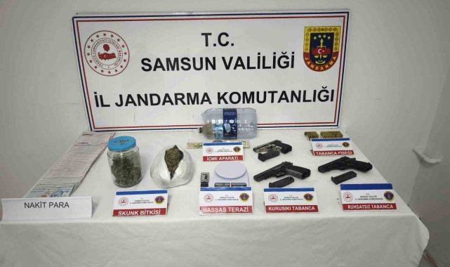 Edinilen bilgiye göre, Atakum İlçe Jandarma Komutanlığı, İl Jandarma Komutanlığı Narkotik Suçlarla Mücadele Şube Müdürlüğü ve İstihbarat Şube Müdürlüğü ekipleri tarafından alınan istihbari bilgiler doğrultusunda Atakum ilçesi Cumhuriyet Mahallesi'nde H.K.'nin (28) ikametinde arama yapıldı. Yapılan aramada 709 gram skunk maddesi, 1 adet ruhsatsız tabanca, 76 adet tabanca fişeği, 2 adet kurusıkı tabanca, 1 adet uyuşturucu öğütme aparatı, 1 adet uyuşturucu içme aparatı, 2 adet hassas terazi ve suçtan elde edildiği değerlendirilen 48 bin 600 TL para ele geçirildi.