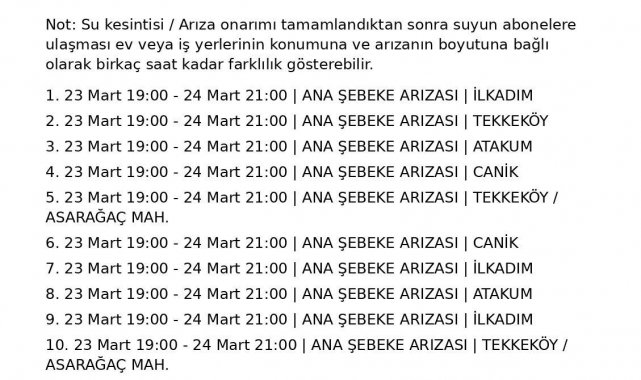 Samsun Büyükşehir Belediyesi Su ve Kanalizasyon İdaresi(SASKİ) tarafından abonelere gönderilen bilgilendirme mesajında, "Ana isale hattında meydana gelen arıza nedeniyle Canik, İlkadım, Atakum ilçeleri ile Tekkeköy ilçesinin bir kısmında (Asarağaç Mahallesi) 24 Mart 2026 tarihi saat 21.00'e kadar su kesintisi yaşanacaktır. Arızanın tamirinden sonra kademeli olarak su verilmeye başlanılacaktır. Anlayışınız ve sabrınız için teşekkür ederiz" denildi.