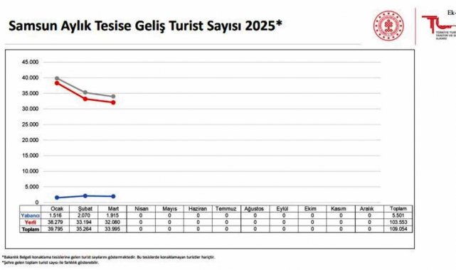 Aylık tesislerde kalan yerli yabancı verilerine göre ise Samsun'da ocak ayında yabancı bin 516 turist, yerli 38 bin 279, şubatta yabancı 2 bin 70 turist, yerli 33 bin 194, martta ise yabancı bin 915 turist ve 32 bin 80 yerli turist olmak üzere 3 ayda 5 bin 501 yabancı, 103 bin 553 yerli olmak üzere toplam 109 bin 54 turist Samsun'da konakladı.