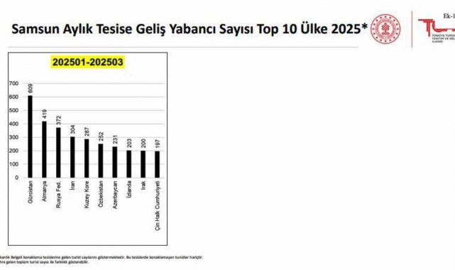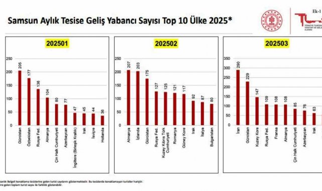 TGA 2025 Ocak-Nisan dönemi Samsun aylık tesise geliş yabancı sayılarını paylaştı. Verilere göre Samsun'da bu yıl ocak ayında tesislerde en çok kalan yabancılar Gürcistan, Özbekistan ve Rusya'dan gelen turistler oldu. Şubatta en çok Almanya, İzlanda ve Gürcistan'dan gelen turistler ve martta ise İran, Gürcistan ve Kuzey Kore'den gelen turistler Samsun'daki tesislerde kaldı. Bu 3 aylık dönemde 609 Gürcistan, 419 Almanya, 372 Rusya, 304 İran, 287 Kuzey Kore, 252 Özbekistan, 231 Azerbaycan, 203 İzlanda, 200 Irak ve 197 Çinli turist Samsun'da tesislerde konakladı.
