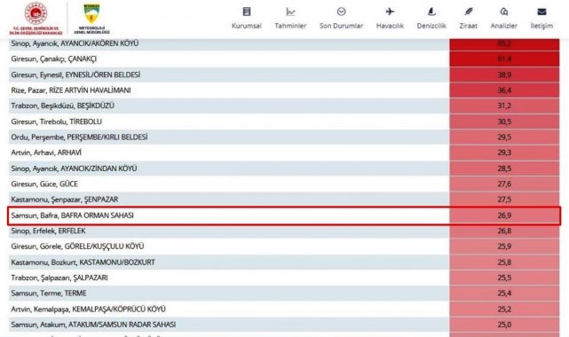 MGM'ye göre son 24 saatte en çok yağış alan il Sinop oldu. Ayancık ilçesinde metrekareye 65 kilo yağış düştü. Sinop'un ardından son 24 saatte en çok yağış alan iller sırasıyla Giresun-Çanakçı, Rize-Pazar, Trabzon-Beşikdüzü, Ordu-Perşembe, Artvin-Arhavi, Kastamonu-Şenpazar ve Samsun-Bafra olarak sıralandı.