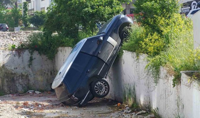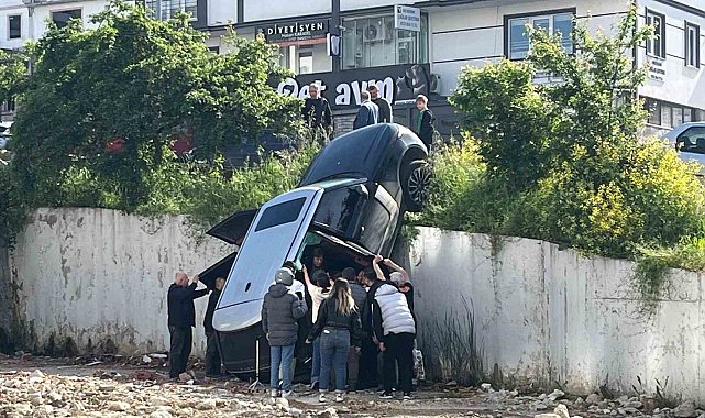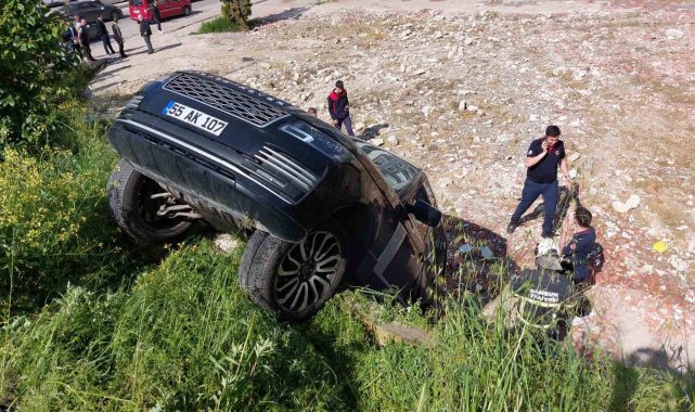 Samsun'da rampa aşağı geri geri kaçan lüks cipin istinat duvarından düşerek asılı kaldığı kazada 2 kadın yaralandı.