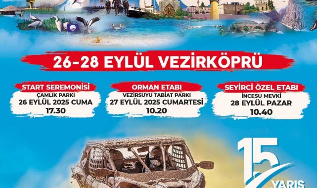 Üç Gün Sürecek Off-Road Maratonu Vezirköprü'de gerçekleşecek yarışların takvimi şöyle: Start Seremonisi: 26 Eylül 2025 Cuma günü saat 17.30'da Çamlık Parkı'nda Orman Etabı: 27 Eylül 2025 Cumartesi günü saat 10.20'de Vezirsuyu Tabiat Parkı'nda Seyirci Özel Etabı: 28 Eylül 2025 Pazar günü saat 10.40'ta İncesu Mevkii'nde yapılacak.