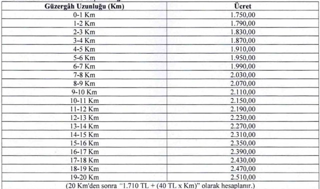 Bu eğitim-öğretim döneminde kullanılacak güzergahlardaki fiyat tarifesi 0-1 km 1750 TL, 1-2 km 1790 TL, 2-3 km 1830 TL, 3-4 km 1870 TL, 4-5 km 1910 TL, 5-6 km 1950 TL, 6-7 km 1990 TL, 7-8 km 2 bin 30 TL, 8-9 km 2 bin 70 TL, 10-11 km 2 bin 150 TL, 11-12 km 2 bin 190 TL, 12-13 km 2 bin 230 TL, 13-14 km 2 bin 270 TL, 14-15 km 2 bin 310 TL, 15-16 km 2 bin 350 TL, 16-17 km 2 bin 390 TL, 17-18 km 2 bin 430 TL, 18-19 km 2 bin 470 TL, 19-20 km ise 2 bin 510 TL olarak belirlendi. Ayrıca tarifede 20 km'den sonrası 1710 + km x 40 TL olarak hesaplanacak.