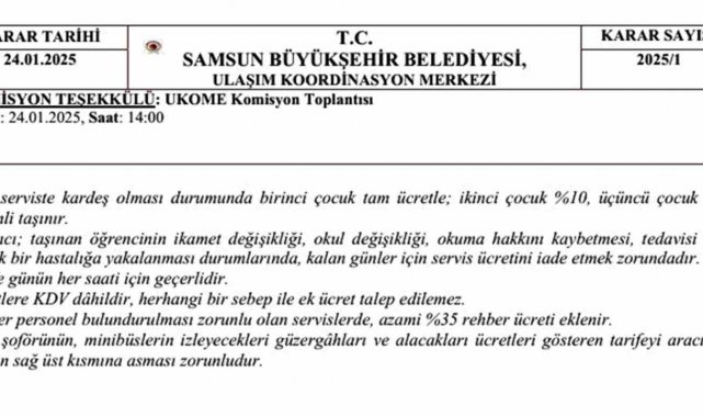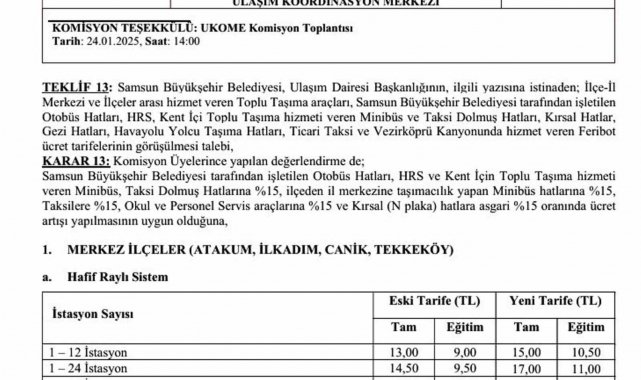 Samsun Büyükşehir Belediyesi Ulaşım Koordinasyon Merkezi (UKOME) Komisyon Toplantısında il genelinde toplu taşıma hizmeti veren araçların ücret tarifesi görüşüldü. Görüşmeler kapsamında otobüs hatları, raylı sistem, minibüs, taksi-dolmuş hatları, ticari taksi, okul-personel servis araçlarına, kırsal (N plaka) hatlara yüzde 15 oranında zam yapılması karara bağlandı.
