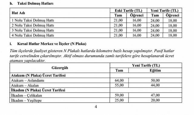 Minibüs-dolmuş hatları fiyat tarifesi güncellemesi kapsamında tam 21 TL'den 24 TL'ye, öğrenci 16 TL'den 18 TL'ye yükseldi. Aynı zamanda 1, 2, 3 ve 4 Nolu Taksi-Dolmuş Hatlarının ücretleri tam 21 TL'den 24 TL'ye, öğrenci 16 TL'den 18 TL'ye çıktı.