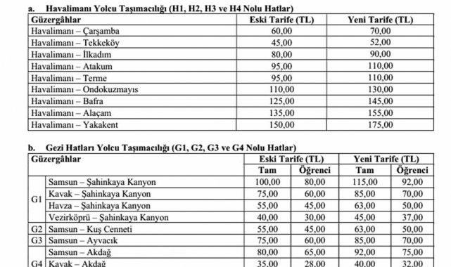 Samsun'da toplu ulaşım hizmeti veren otobüs hatları, hafif raylı sistem (tramvay), minibüs, taksi-dolmuş hatları, ticari taksi, okul-personel servis araçlarına ve kırsal (N plaka) hatlara yüzde 15 oranında zam yapıldı.