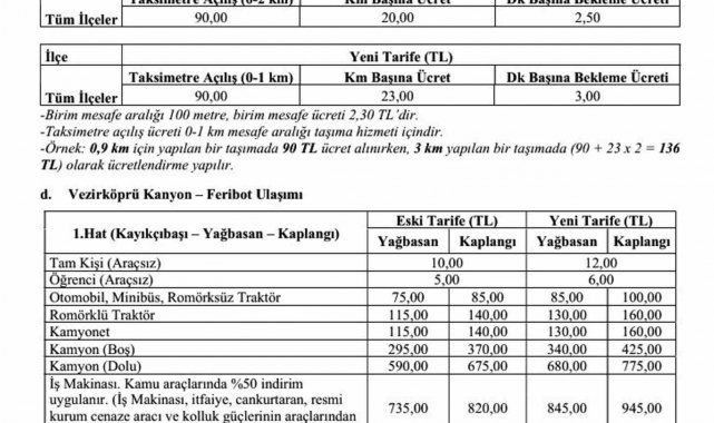 Mevcut tarifede taksimetre açılışı (0-2 km) 90 TL'den (0-1 km) 90 TL'ye yükseltildi. Ayrıca kilometre başında ücret 20 TL'den 23 TL'ye, dakika başına ücret de 2,5 TL'den 3 TL'ye çıkartıldı.