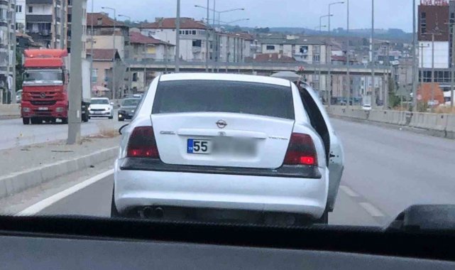 Samsun'da seyir halindeyken yarış yapan bir otomobildeki yolcu, arka kapıyı açarak hem tehlikeli şekilde yolculuk yaptı hem de yarıştıkları araçların videosunu çekti.