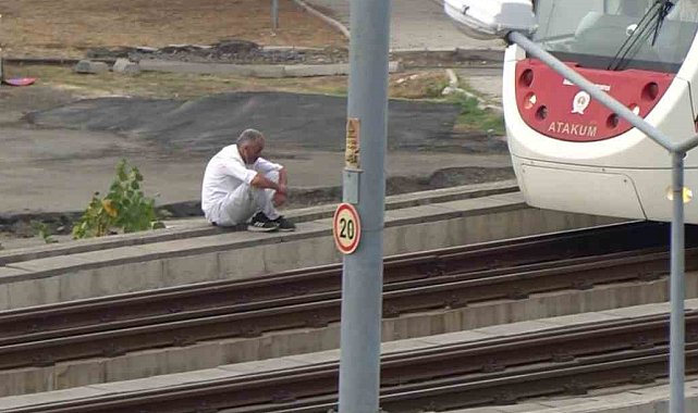 Samsun'da tramvay hattının geçtiği üst geçide çıkan şahıs, rayların üzerinde müzik dinlerken görüntülendi. Durumu fark eden vatman, kazaya sebep olmamak için treni durdurarak şahsı tramvaya aldı.