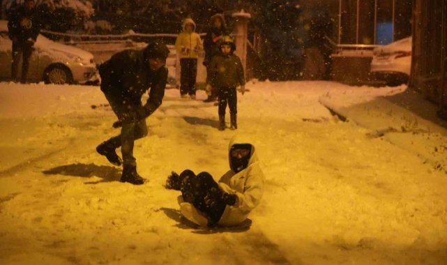Öte yandan, yoğun kar yağışı çocuklar için eğlenceye dönüştü. Mahalle aralarında ve yokuşlarda toplanan çocuklar, poşetlerini alarak karla kaplanan yollarda kaydı. Ortaya renkli görüntüler çıkarken, çocukların kar sevinci objektiflere yansıdı.