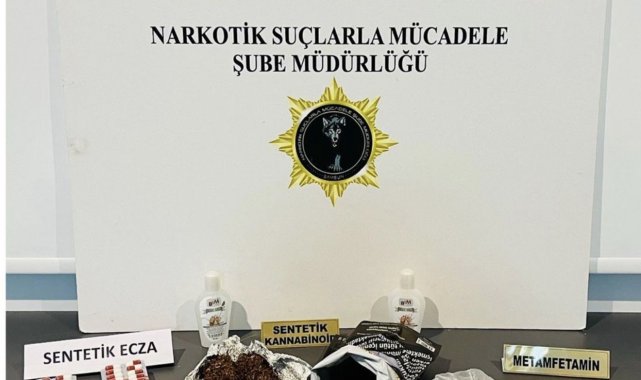 Yapılan aramalarda 1007 adet sentetik ecza, 193,60 gram metamfetamin, 109,30 gram sentetik kannabinoid, 90 mililitre aseton, 2,15 gram fubinica, 7 adet ecstasy hap, 1 adet esrarlı sigara ve 2 adet hassas terazi ele geçirilerek el konuldu.