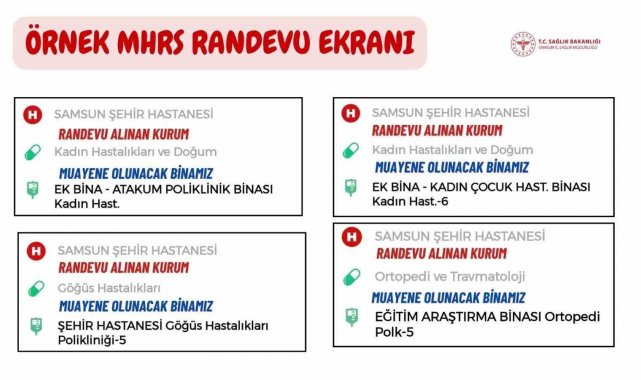 Samsun İl Sağlık Müdürlüğü tarafından yapılan açıklamada, "1 Aralık tarihi itibariyle Eğitim ve Araştırma Ana Bina, Atakum Polikliniği / Kadın Doğum ve Çocuk Hastalıkları ve Onkoloji Ek Hizmet Binalarımızın MHRS randevuları Samsun Şehir Hastanesi bünyesinde hizmet vermeye başlamaları nedeniyle bu hastanemiz üzerinden alınacaktır. MHRS Randevu ekranında randevu alınan kurum olarak 'Samsun Şehir Hastanesi' muayene olunacak yer olarak da ilgili ek hizmet binamız belirtilmektedir.