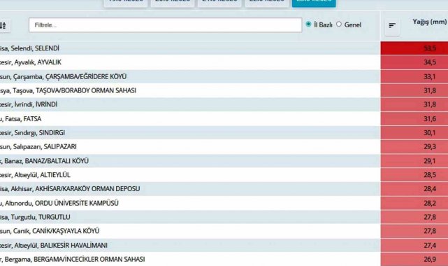 SAMSUN (İHA) – Meteoroloji Genel Müdürlüğü (MGM) verilerine göre Samsun, Türkiye'de son 24 saatte en çok yağış alan 3. il oldu.