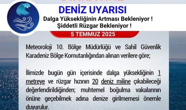 Samsun Valiliği tarafından yapılan açıklamada, "Meteoroloji 10. Bölge Müdürlüğü ve Sahil Güvenlik Karadeniz Bölge Komutanlığından alınan verilere göre; ilimizde bugün gün içerisinde dalga yüksekliğinin 1 metreye ve rüzgar hızının 20 deniz miline çıkabileceği değerlendirildiğinden; muhtemel boğulma vakalarının önüne geçebilmek adına denize girilmemesi önemle duyurulur" ifadelerine yer verildi.