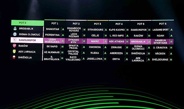 UEFA Konferans Ligi'nde 2025-2026 sezonu lig aşaması kura çekimi, Monaco'daki Grimaldi Forum'da gerçekleştirildi. Organizasyonda bu sezon Türkiye'yi temsil eden tek takım olan Samsunspor; Dinamo Kiev (Ukrayna), Legia Varşova (Polonya), AEK (Yunanistan), Mainz (Almanya), Hamrun Spartans (Malta) ve Breidablik (İzlanda) ile eşleşti. Kırmızı-beyazlılar; Dinamo Kiev, AEK, ve Hamrun Spartans ile sahasında, Legia Varşova, Mainz, ve Breidablik ile deplasmanda karşılaşacak.