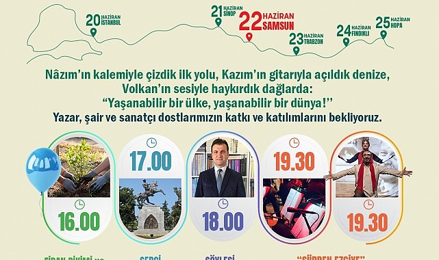Karadeniz'in unutulmaz sanatçıları Nazım Hikmet, Kazım Koyuncu ve Volkan Konak anısına düzenlenen "Nazım'dan Kazım'a bir Volkan'dır Karadeniz" başlıklı sanat organizasyonu, İstanbul'dan başlayarak Sinop, Samsun, Trabzon, Ordu ve Artvin'de sanatseverlerle buluşacak.