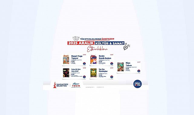 Sancaktepeli'lerin yoğun ilgi göstermesi beklenen etkinlikler kapsamında; tiyatro oyunları, sahne gösterileri ve çocuklara özel etkinlikler ay boyunca izleyiciyle buluşacak. Etkinlikler kapsamında; 6 Aralık Cumartesi saat 12.00'de Sarıgazi Kültür Merkezi'nde "Mozart Yoga Yapıyor", 13 Aralık Cumartesi 12.00'de Mustafa Öncel Kültür Merkezi'nde "Benim Komik Dedem", 13 Aralık Cumartesi 19.00'da Sancaktepe Sahnesi'nde "Aşıklar Şöleni", 14 Aralık Pazar, 18.00'de Sancaktepe Sahnesi'nde "Yalnız Bir Ruh", 21 Aralık Pazar 12.00'de Dr. Kadir Topbaş Kültür Merkezi'nde "Çikolatalar Ülkesi", 25 Aralık Perşembe 20:30'da Sancaktepe Sahnesi'nde "Engin Nurşani Anma Programı" ve 27 Aralık Cumartesi 12:00'de Sarıgazi Kültür Merkezi'nde "Rüya Takımı" ücretsiz olarak sahnelenecek. Etkinliğe ilişkin Sancaktepe Belediye Başkanı Alper Yeğin, kültür ve sanatın toplumun gelişiminde önemli bir yere sahip olduğuna dikkat çekerek, "Sancaktepe'de her yaştan vatandaşımızın kültür ve sanata erişimini kolaylaştırmak için çalışmalarımızı sürdürüyoruz. Aralık ayında da dopdolu bir programla hem çocuklarımızı hem ailelerimizi kültürle buluşturacağız. Tüm komşularımızı bu etkinliklere davet ediyorum" ifadelerini kullandı.