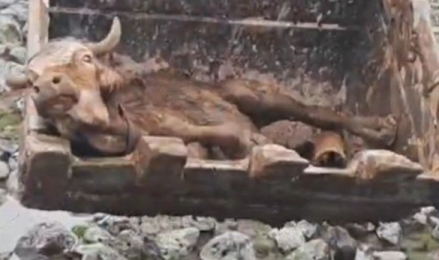 Şanlıurfa'da çamura saplanan inek kepçe yardımıyla kurtarıldı
