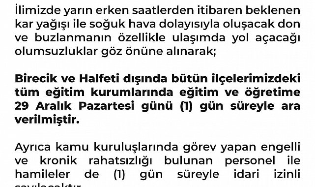 Şanlıurfa Valiliğinden yapılan açıklamada, "İlimizde yarın erken saatlerden itibaren beklenen kar yağışı ile soğuk hava dolayısıyla oluşacak don ve buzlanmanın özellikle ulaşımda yol açacağı olumsuzluklar göz önüne alınarak; Birecik ve Halfeti dışında bütün ilçelerimizdeki tüm eğitim kurumlarında eğitim ve öğretime 29 Aralık Pazartesi günü 1 gün süreyle ara verilmiştir. Ayrıca kamu kuruluşlarında görev yapan engelli ve kronik rahatsızlığı bulunan personel ile hamileler de 1 gün süreyle idari izinli sayılacaktır" denildi.