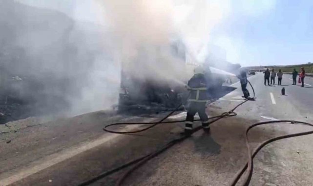 Şanlıurfa'nın Birecik ilçesinde alev alan saman yüklü tır kullanılmaz hale geldi.
