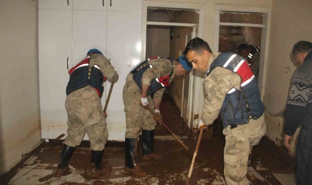Şanlıurfa'da yaşanan selden zarar gören vatandaşların yardımına koşan Mehmetçik, evlerindeki eşyaları tahliye edip içerdeki balçığı temizliyor.