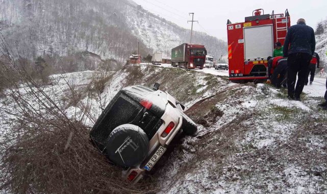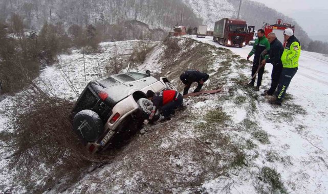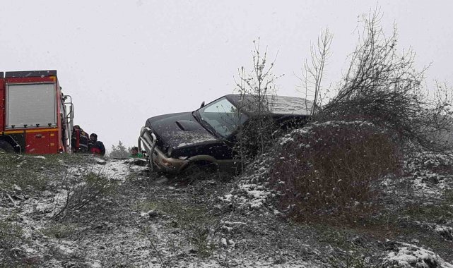 Bolu'nun Mudurnu ilçesinde kar sebebiyle direksiyon hakimiyetini kaybeden sürücü, aracıyla şarampole devrildi. Takıldığı ağaç sebebiyle şarampole yuvarlanmaktan kurtulan sürücü, korna çalarak yardım istedi. Bölgeye gelen ekipler tarafından kurtarılan sürücü yara almadan kurtuldu.