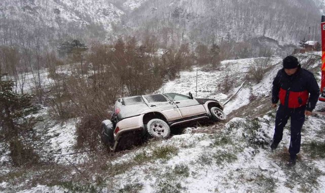 Şarampole devrilen cipin sürücüsü ölümden ağaç sayesinde kurtuldu