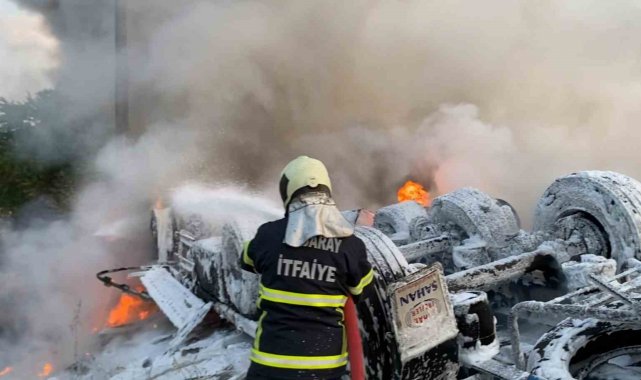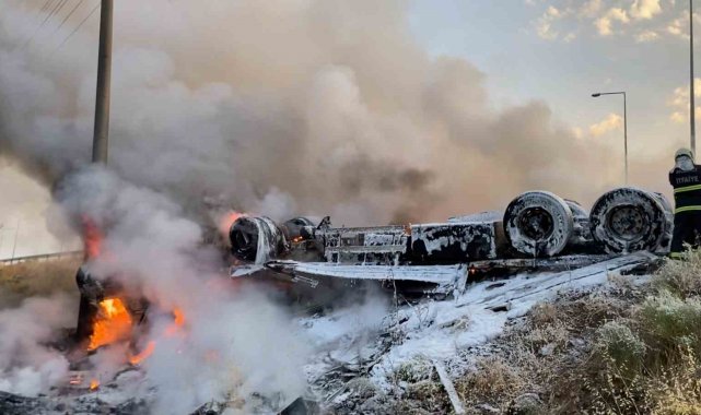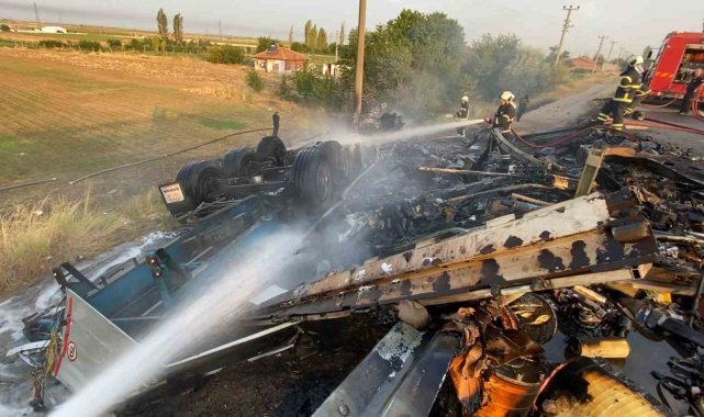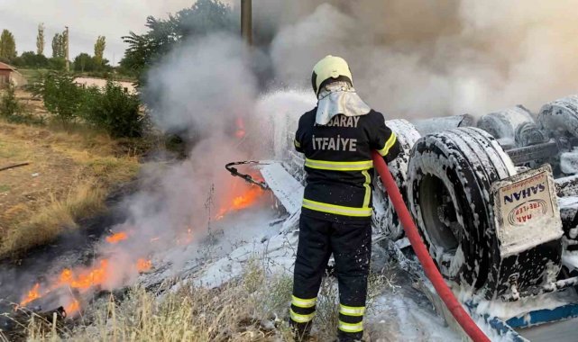Aksaray'da sürücüsünün direksiyon hakimiyetini kaybettiği araç yedek parçası ve motor yağı ile antifriz yüklü tır şarampole devrildi. Kaza sonrası yanmaya başlayan tır alev topuna dönerken, yaralanan sürücü son anda kurtuldu.