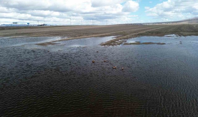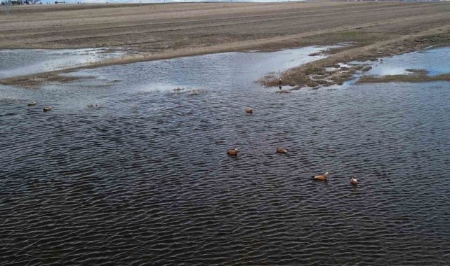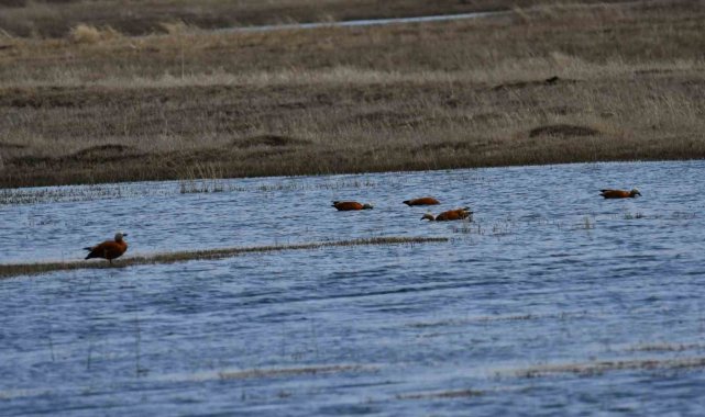 Havaların ısınmasıyla birlikte göçmen kuşlar da Kars'a gelmeye başladı. Sarıkamış'ta sulak alana gelen angutlar, eşleriyle birlikte gölette yiyecek ararken dron ile görüntülendi.