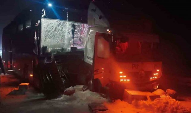 Sarıkamış'ta buzlanan yolda otobüs kamyona çarptı. Kazada 9 kişi yaralandı.
