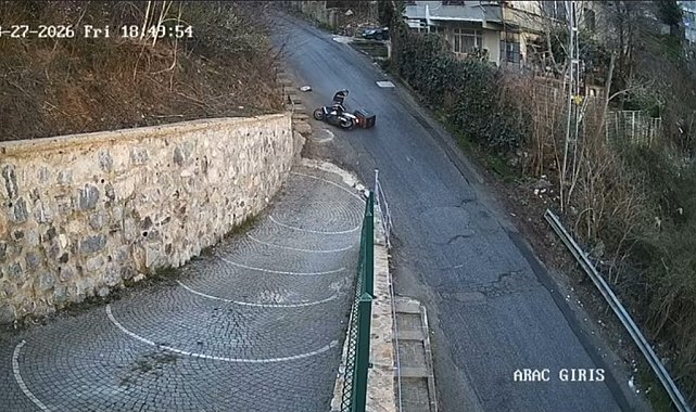 Sarıyer'de bozuk yolda kayan motosiklet sürücüsü, motosikletinin hakimiyetini kaybederek düştü. Belinden yaralanan sürücüye çevredekilerin yardım ettiği anlar güvenlik kamerasına yansıdı.