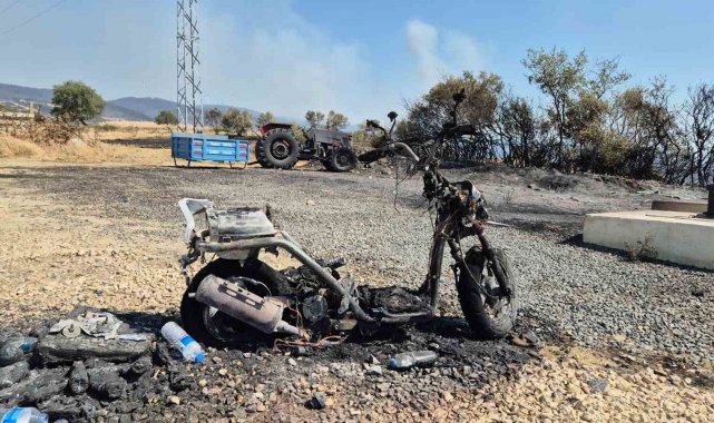 Tekirdağ'ın Şarköy ilçesinde etkisini sürdüren orman yangınında bir traktör ve bir motosiklet yanarak demir yığınına döndü.