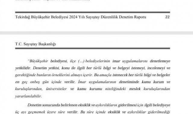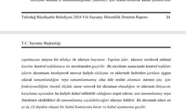 Sayıştay'ın CHP'li Tekirdağ Büyükşehir Belediyesi'ne yönelik 2024 yılı düzenlilik denetimi, belediyenin çeşitli birimlerinde ihale süreçlerinden mali işlemlere, personel ödemelerinden imar denetimlerine kadar toplam 19 ayrı mevzuata aykırılığı ortaya çıkardı. Raporda, yıllardır tamamlanamayan yapım işleri, rekabeti daraltan şartnameler, izinsiz kamuoyu araştırması ödemeleri, kaydı olmayan personele fazla mesai verilmesi ve ticari plakaların ihalesiz kullandırılması gibi dikkat çeken usulsüzlükler yer aldı.