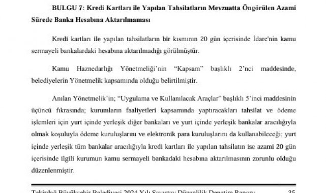 POS cihazları üzerinden yapılan tahsilatların süresinde bankaya aktarılmadığı, teminat süresi içindeki kusur ve eksiklerin giderilmesi konusunda yüklenicilere yazılı ihtar yapılmadan belediyenin bizzat işlem yaptığı da tespit edildi. Raporda ayrıca yeni fiyat oluşturulurken Ticaret ve Sanayi Odası onayı alınmadığı ve bazı yapım işlerinde zorunlu olan Genişletilmiş Bakım Devresi sigortasının yaptırılmadığı ifade edildi.