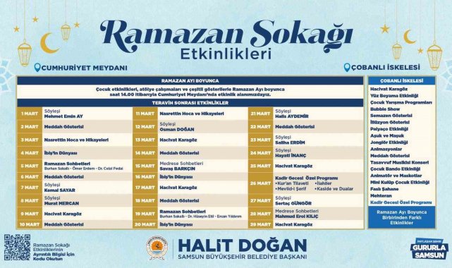 Samsun Büyükşehir Belediye Başkanı Halit Doğan, "Ramazan ayının ruhuna uygun bir şekilde, değerli hemşehrilerimizle bir araya gelerek hem eğlenceli hem de manevi açıdan zenginleştirilmiş bir Ramazan dönemi geçirmek istiyoruz. Bu doğrultuda iki farklı lokasyonda Ramazan Sokağımızı kuruyoruz. Şehrimizde uzun yıllar sonra kurulan Ramazan Sokaklarımız ile Ramazan'ın manevi derinliğini ve coşkusunu şehrimizde en içten şekilde hissedeceğiz. Ramazan ayı boyunca hem gönül sofralarında buluşacak hem de Ramazan Sokaklarımız ile birbirinden keyifli ve anlam dolu etkinliklerle hemşehrilerimizle bir araya geleceğiz. Cumhuriyet Meydanı'ndaki iftar çadırımızın yanı sıra 153 Restoranlarımızda da hemşehrilerimiz ücretsiz bir şekilde iftarlarını açabilecekler. Ramazan ayının tüm hemşehrilerimize sağlık, huzur ve bereket getirmesini temenni ediyor; Ramazan Bayramı'na hep birlikte, sağlıklı, mutlu ve huzurlu bir şekilde ulaşmayı diliyorum" ifadelerini kullandı.
