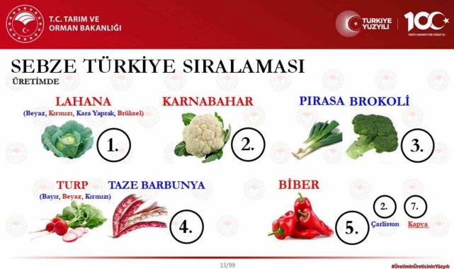 Sebze üretiminde Türkiye'nin demirbaşlarından olan Samsun, lahanada 1'inci, karnabaharda 2'nci, brokolide, pırasada 3'üncü, barbunya, turpta 4'üncü, biberde 7'nci ve taze fasulyede ise 8'inci sırada yer alıyor. TÜİK rakamlarına göre Samsun'da yılda ortalama 327 bin 789 ton lahana, 59 bin 679 ton karnabahar, 12 bin 23 ton brokoli, 19 bin 470 ton pırasa, 5 bin 162 ton barbunya, 6 bin 738 ton turp, 158 bin 570 ton biber ve 15 bin 176 ton da taze fasulye üretiliyor.