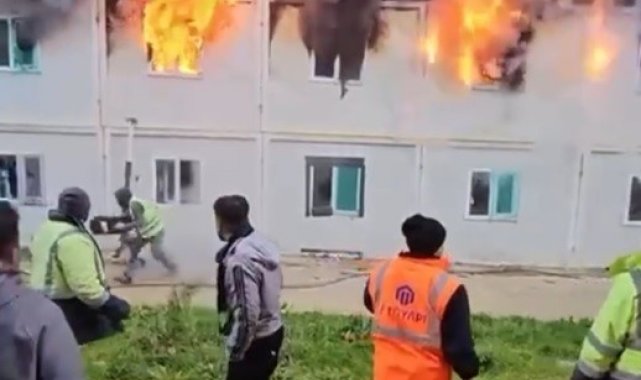Olayın ardından ortaya çıkan yeni görüntülerde, konteynerlerin adeta bir alev topuna döndüğü, dumanların gökyüzünü kaplandığı ve işçilerin uyudukları yapının kül olmasına şahit olduğu anlar yer aldı.