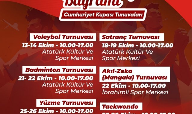 Cumhuriyet coşkusunu sporla bütünleştirmek amacıyla düzenlenen etkinlikler kapsamında 13-14 Ekim tarihlerinde Atatürk Kültür ve Spor Merkezi'nde Voleybol Turnuvası, 18-19 Ekim tarihlerinde yine aynı merkezde Satranç Turnuvası, 21-22 Ekim tarihlerinde Badminton Turnuvası, 22 Ekim'de İbrahimli Spor Merkezi'nde Akıl ve Zeka Oyunları (Mangala) Turnuvası, 25-26 Ekim tarihlerinde Alleben 1 Yüzme Havuzu'nda Yüzme Turnuvası ve aynı tarihlerde Atatürk Kültür ve Spor Merkezi'nde Taekwondo Turnuvası düzenlenecek. Her biri farklı yaş gruplarına hitap eden bu etkinliklerle, öğrenciler hem yeteneklerini sergileyecek hem de Cumhuriyet Bayramı'nın coşkusunu hep birlikte yaşayacak.