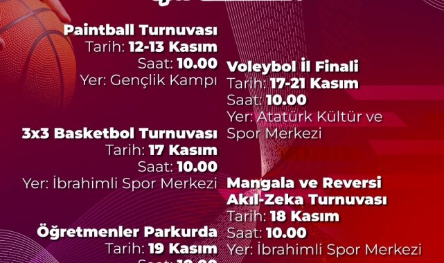 Şehitkamil Belediyesi Gençlik Kampı, İbrahimli Spor Merkezi ve Atatürk Kültür ve Spor Merkezi'nde düzenlenecek etkinlikler, öğretmenlerin katılımıyla renkli görüntülere sahne olacak. Etkinlik takvimi kapsamında 12-13 Kasım'da Paintball Turnuvası, 17 Kasım'da 3x3 Basketbol Turnuvası, 17-21 Kasım'da Voleybol İl Finali, 18 Kasım'da Mangala ve Reversi (Akıl-Zeka) Turnuvası, 19 Kasım'da ise "Öğretmenler Parkurda" etkinliği gerçekleştirilecek.