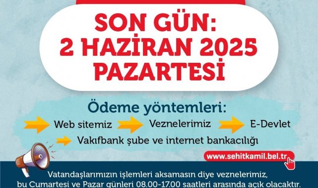 Şehitkamil Belediyesi tarafından yapılan yazılı açıklamada, emlak, ilan ve çevre temizlik vergisi 1. taksit son ödeme tarihinin 02 Haziran Pazartesi olduğu hatırlatıldı. Açıklamada, hafta sonu da belediye veznelerinin açık olacağı belirtilerek, "2025 yılı emlak, arsa ve iş yerlerine ait emlak vergisi, çevre temizlik vergisi, ilan-reklam vergisinin 1. taksitine dair borçların ödemelerinin 02 Haziran 2025 Pazartesi tarihine kadar yapılması gerekmektedir. Mükelleflerimiz ödemelerini; bu tarihe kadar Şehitkamil Belediyesi vezneleri, sehitkamil.bel.tr adresi üzerinden ya da internet bankacılığı üzerinden yapabileceklerdir. Vatandaşlarımızın işlemleri aksamasın diye veznelerimiz bu Cumartesi ve Pazar günleri 09.00 ile 16.00 saatleri arasında açık olacaktır" ifadelerine yer verildi.