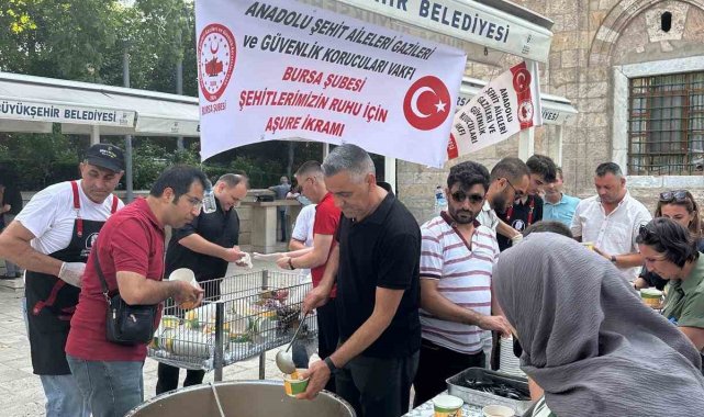 Anadolu Şehit Aileleri Gazileri ve Güvenlik Korucuları Vakfı (AŞAV) Bursa Şubesi, şehitlerin hayrına Bursa Ulu Cami avlusunda binlerce vatandaşa aşure ikram etti.