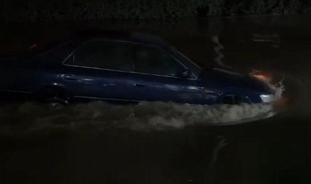 Görüntülerde otomobilin, sel sularının arasında neredeyse yüzerek ilerlediği ve çevredeki vatandaşların şaşkınlıkla durumu izlediği görülüyor.