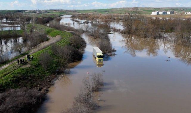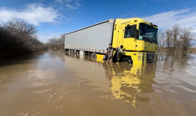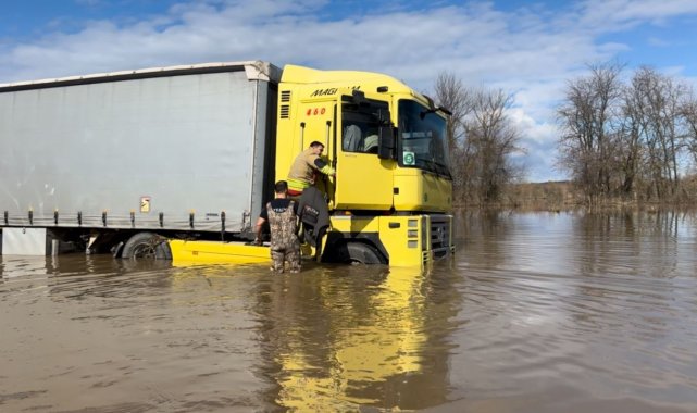 Edirne'de Tunca Nehri'nin taşması sonucu Avarız köyü yolunda tırıyla mahsur kalan Bulgar sürücü, itfaiye ekiplerinin operasyonuyla kurtarıldı.