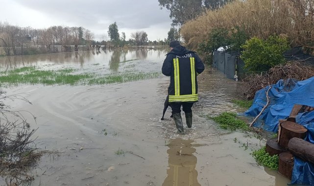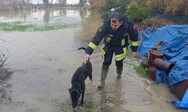 Adana'da sel sularının yükselmesiyle bir bahçede mahsur kalan köpeği AKOM ekipleri kurtardı.
