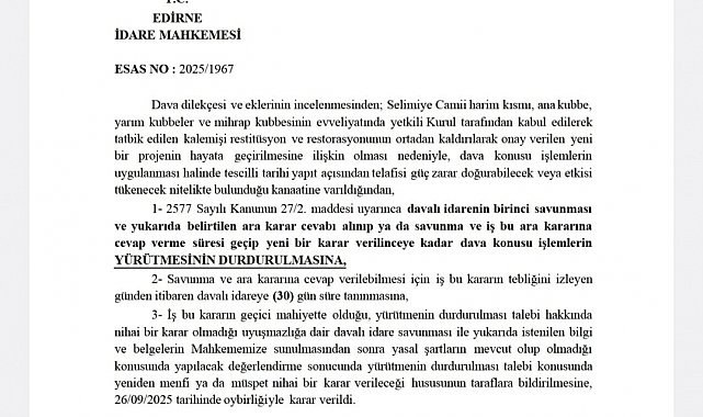 UNESCO Dünya Kültür Mirası Listesi'nde yer alan ve Mimar Sinan'ın "ustalık eserim" dediği Selimiye Camii'nde restorasyon sürecinde kubbe yazılarında yapılması planlanan değişikliğe Edirne İdare Mahkemesi "dur" dedi. Mahkeme, yürütmenin durdurulmasına karar verdi. Mahkeme ayrıca kubbe yazılarında yapılmak istenen değişiklik için yürütmeyi durdurdu.