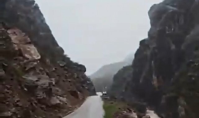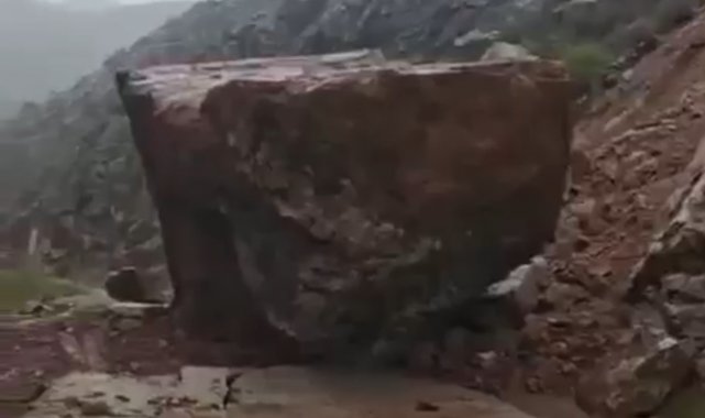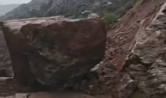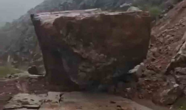 Hakkari'nin Şemdinli ilçesinde etkili olan sağanak yağışlar sonrası yamaçtan kopan dev kaya kütlesi yolu ulaşıma kapattı.