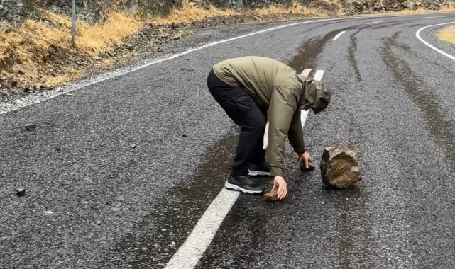 Dün başlayan yoğun yağışlar hayatı olumsuz yönde etkilerken, bölgede bir çok noktada kar yağışı da etkili oldu. Şemdinli-Derecik karayolunda etkili olan yağış etkisiyle dağlardan çok sayıda kaya parçası yola düştü. Gezi ve okul programları için Derecik ilçesine giden Yüksekova Ekoloji Kültürel ve Dağcılık Spor Kulübün Başkanı Suat Öztekin, araçtan inerek kaya parçaları tek tek kaldırıp yol kenarına bıraktı.
