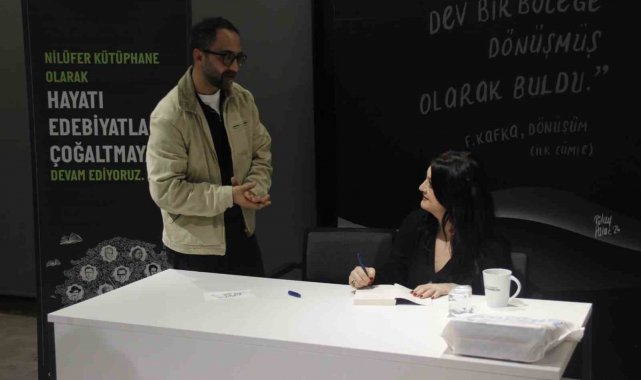 Söyleşinin sonunda katılımcıların sorularını da yanıtlayan Seray Şahiner'e, Nilüfer Belediye Meclis Üyesi Furkan Yavuz günün anısına hediye verdi. Yazar Şahiner, okurları için kitaplarını da imzaladı.