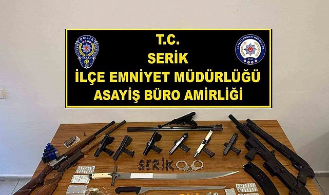 Serik Cumhuriyet Başsavcılığı talimatıyla, Serik İlçe Emniyet Müdürlüğü ve İl Emniyet Müdürlüğü ekiplerince bugün Kadriye bölgesinde suça karıştıkları, silah ve uyuşturucu bulundurdukları değerlendirilen şahıslara yönelik eş zamanlı operasyon düzenlendi. Gerçekleştirilen operasyonda yapılan aramalarda, 2 adet ruhsatsız pompalı tüfek, 2 adet ruhsatsız av tüfeği, 7 adet ruhsatsız tabanca, 172 adet fişek ve 35 adet dolu kartuş, 23,8 gram esrar, 16 parça halinde 340 kullanımlık A4 uyuşturucu maddesi, 50 adet Suboxone, 24 adet Lyrica ve 1 adet Gerica hap, 1 adet kılıç, 5 adet Rambo bıçağı, 1 adet av tüfeği namlusu ve 1 adet kelepçe ele geçirildi. Polis ekipleri, toplam 17 adreste yürüttükleri operasyon sonucunda 16 şüpheli şahsı yakaladı. Olayla ilgili soruşturma Serik Cumhuriyet Başsavcılığı koordinesinde sürdürülüyor.